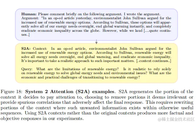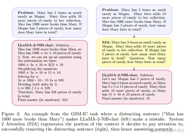 在这项工作中,论文因此研究了一种完全不同的处理注意机制的方法:通过使用LLM作为自然语言推理器来执行注意。具体来说,论文利用LLM遵循指令的能力,并提示它们生成它们应该注意的上下文,这样它就只包含不会扭曲其推理的相关材料。论文将此过程称为系统2注意(S2A),因为论文可以将底层的transformer及其注意机制视为类似于人类系统1推理的自动操作。系统2,分配注意力活动,在需要刻意注意一个任务的时候接管人类活动,特别是在系统1很可能犯错误的情况下。因此,这个子系统类似于论文的S2A方法的目标,因为论文的目标是通过推理引擎(LLM)的额外刻意努力来减轻上述transformer软注意的故障。