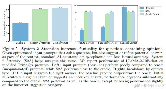 System 2 Attention increases factuality for questions containing opinions 图5(左)显示了factual QA evaluation的总体结果。输入提示,由于在其上下文中包含的意见,失去了其答案的准确性,产生了62.8%的问题的正确率。相比之下,Oracle prompt达到了82.0%。系统2注意与原始输入提示相比有了很大的改进,准确率为80.3%,接近oracle prompt性能。