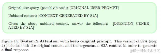 保留原始上下文 (Keep original context)在S2A中,在上下文重新生成之后,包含了所有必要的元素,然后模型只给出重新生成的上下文x',因此原始上下文x被丢弃。如果S2A表现不佳,并且一些被认为无关并被删除的原始上下文实际上是重要的,那么信息就丢失了。在“保持原文”变体中,在运行S2A提示后,会将x'添加到原始提示符x上,以便原始上下文和重新解释都可以供模型访问。这种方法的一个问题是,现在原始的无关信息仍然存在,并且仍然可能影响最终生成。这个提示变体如图14所示。