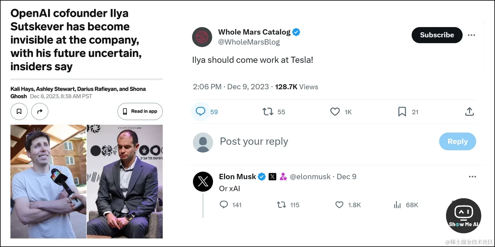 12月9日,社交平台X博主@WholeMarsBlog 转发了这篇报道,并评论「Ilya Sutskever 应该跳槽去特斯拉」,马斯克随机跟帖评论「去 xAI 也行」,看起来是向 Ilya 抛出了橄榄枝。