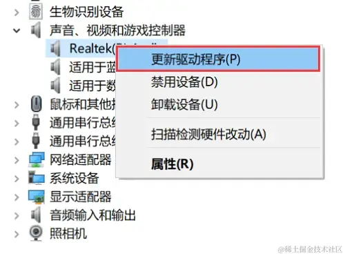 步骤4:检查列出的音频设备是否有黄色感叹号或问号,如果有,可能需要更新驱动程序。右键点击设备,选择【更新驱动程序】 。