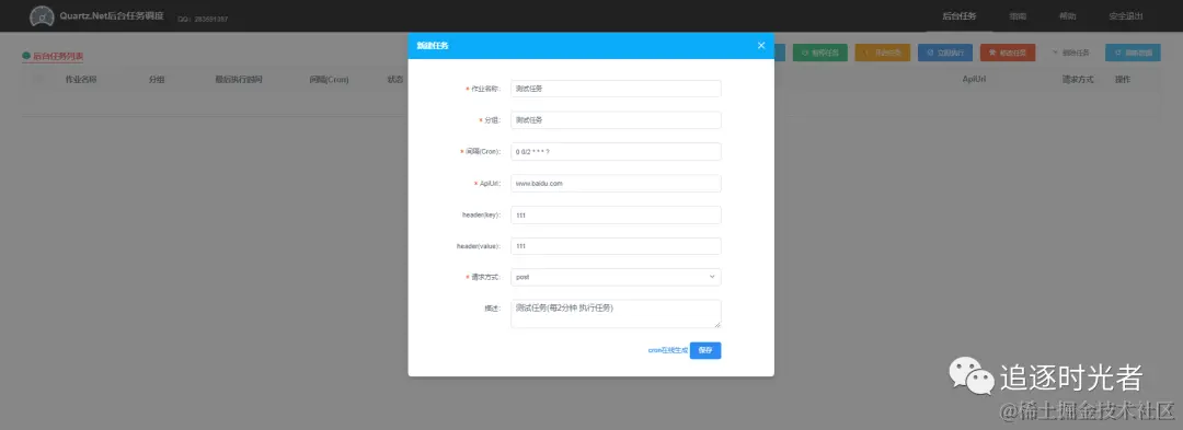 定时任务调度应该是平时业务开发中比较常见的需求,比如说微信文章定时发布、定时更新某一个业务状态、定时删除一些冗余数据等等。今天给大家推荐一个基于.NET Core + Quartz.NET + Vue + IView开箱即用的定时任务UI(不依赖数据库,只需在界面做简单配置):Quartz.NetUI。