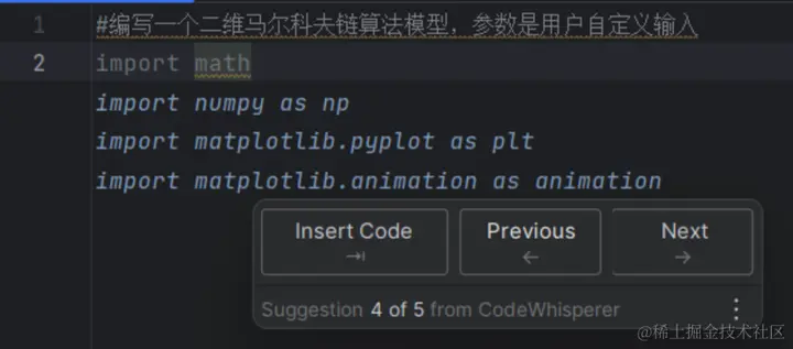 可以看到,如下图,我只是简单输入了 import math,Amazon CodeWhisperer 就已经帮我补全了其他所需要的常见数学计算包。