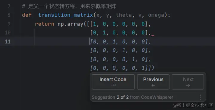 可以看到,Amazon CodeWhisperer 直接提供好了一个初始矩阵给我,非常的方便。