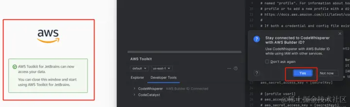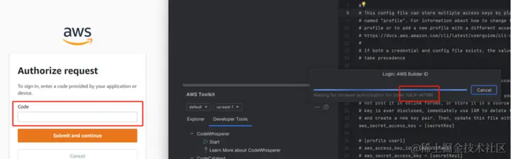 然后我们在插件中进一步处理,使用个人亚马逊云科技账号去使用 Amazon CodeWhisperer~