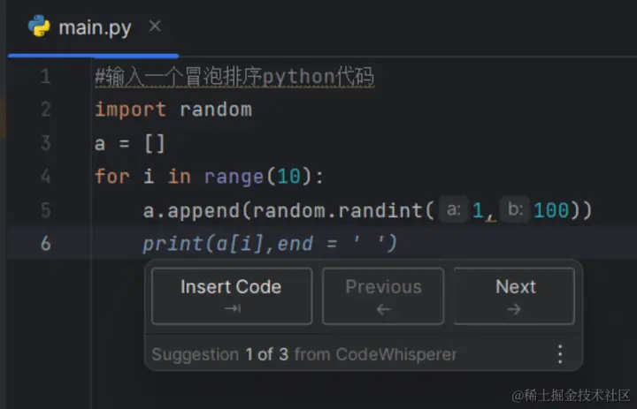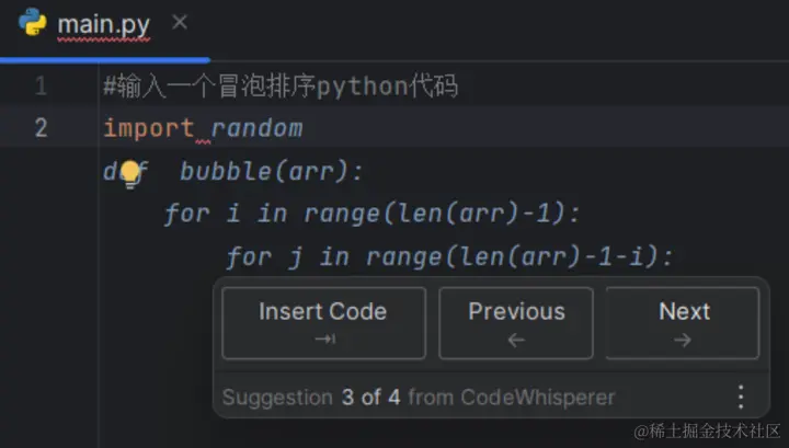 我们先来使用 Amazon CodeWhisperer 写一个简单的冒泡排序,咱看看效果。首先输入我们的注释,这样 Amazon CodeWhisperer 就知道们要干什么了,然后我们输入 import,就可以看到 Amazon CodeWhisperer 自动帮我们补全了 random 函数。