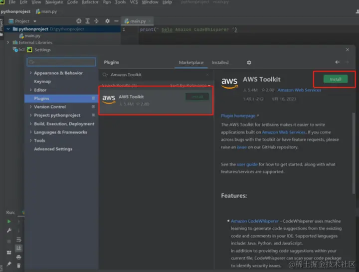 首先我们在 Pycharm 的设置 Settings 中,找到插件,然后搜索 “Amazon Toolkit”。点击 Install,等待下载完成后,重启 Pycharm 即可~