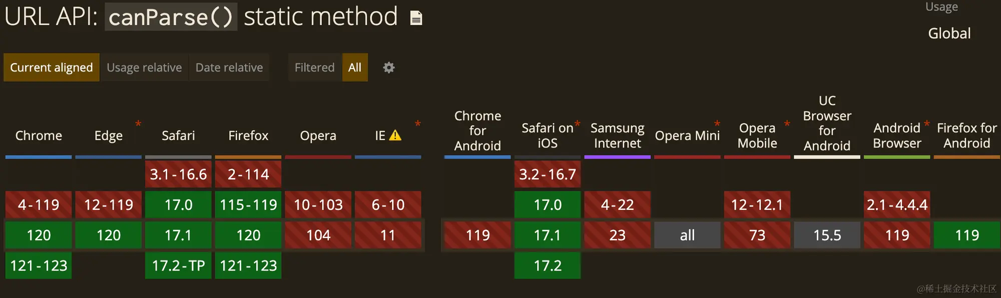 URL.canParse() 是一种快速验证字符串是否为有效的URL的方法。然而我们也不要高兴太早,URL.canParse()方法还存在浏览器兼容问题,在写这篇文章时支持该方法的浏览器版本如下图: