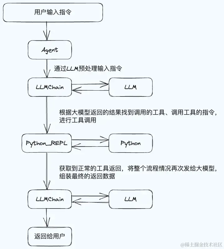 通过打开 Debug 开关,我们得以见到 LangChain 中 Agent 功能的详细工作流程和日志,简单梳理一下本次请求中 Agent 的工作如下图: