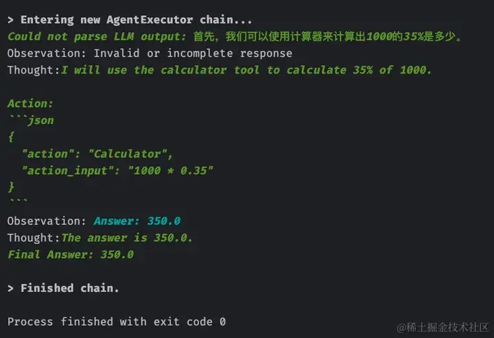 1.LangChain 通过分析,决定调用 Calculator tool 计算最终的结果,并且分析出了需要传入的数据格式,最终根据返回的结果得到了正确的答案 350.0。