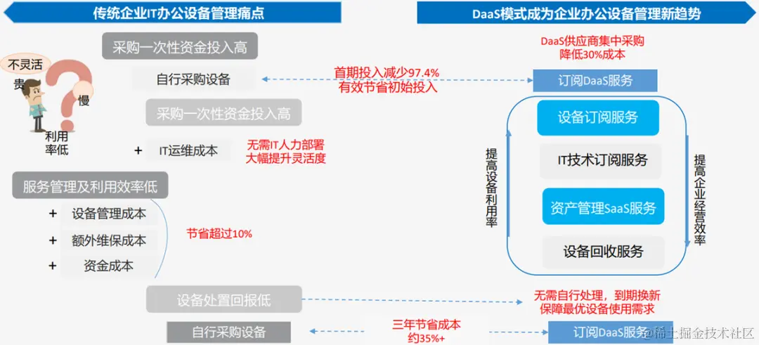 简单来看, DaaS的一个关键出发点是企业以租赁代替购买,将资产压力转移、现金流支出摊平到长周期,通过降低企业的IT成本,撬动着更大规模的降本增效。《2023年中国DaaS行业市场需求洞察报告》数据显示,DaaS服务模式可帮助企业减少97%以上的首期投入,在三年内节省35%左右的运营成本,性价比十分显著,尤其是资产压力本身就较大的实体企业和中小企业,对此需求会更为迫切。