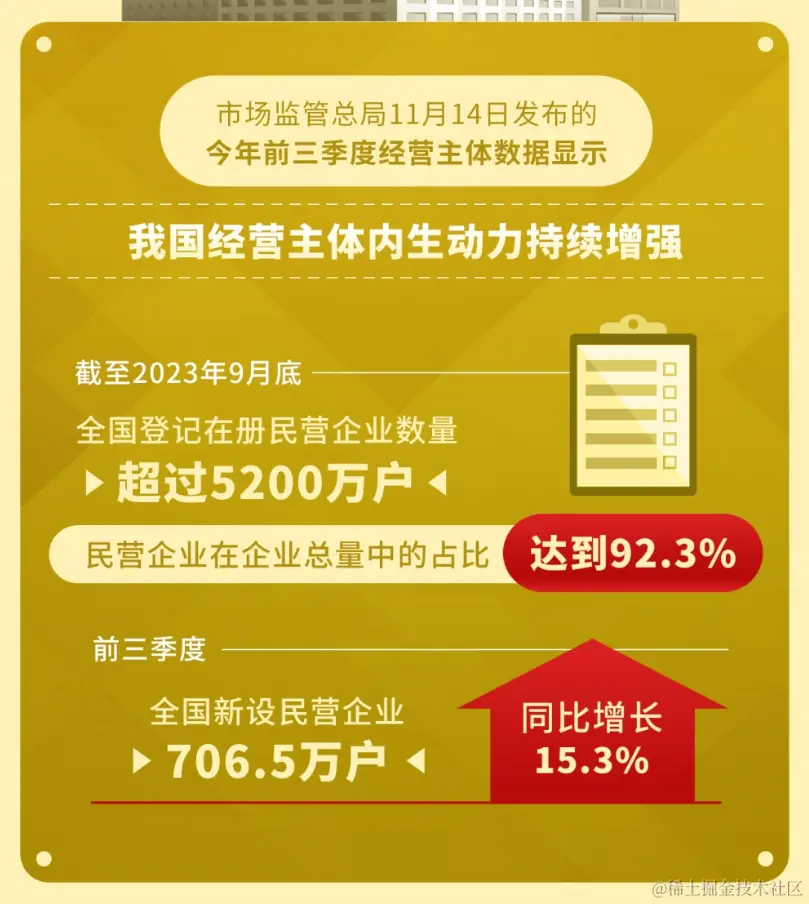 11月中旬,市场监管总局发布了2023年前三季度经营主体数据。其中,前三季度全国新设民营企业总计706.5万户,截至9月底,全国登记在册的民营企业数量超过5200万户,在企业总量中占比高达92.3%。如何帮助民营企业实现高质量发展,已成为增强经济韧性、提升发展潜力的重中之重。