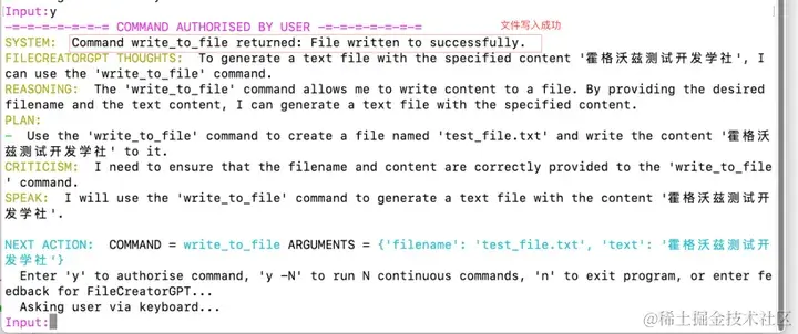 # 输入“y”授权命令,“y -N”运行 N 个连续命令,“n”退出程序,或输入 FileCreatorGPT 的反馈...