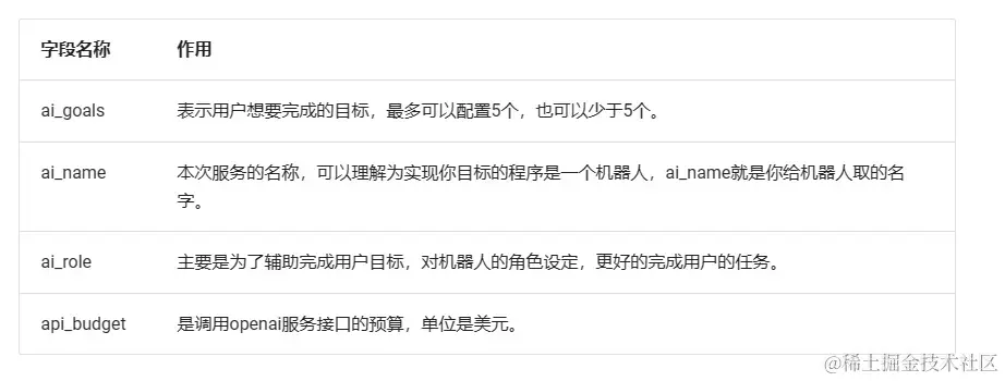 在使用 AutoGPT 的过程中,AutoGPT 可能会给相关的提示信息,主要包含以下几个字段: