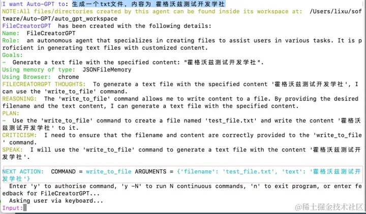 3.此时 AutoGPT 提示我们输入信息,输入提示词:生成一个.txt文件,内容为 霍格沃兹测试开发学社。