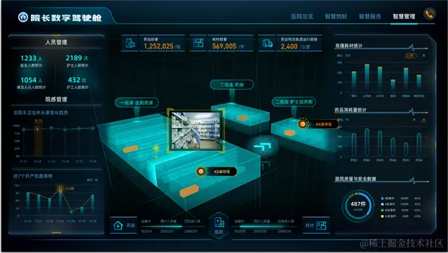 结合医院官方平面图,进行医院大楼的大屏建模,大屏两侧显示耗材情况、医院质量和安全指数、人员管理和院感管理系统。还配有多功能模块显示患者画像,分析患者情况和疾病现状,对患者人数进行预测,以便出现问题做出及时的反应。(了解案例详情或更多行业应用可前往易知微官网查看)