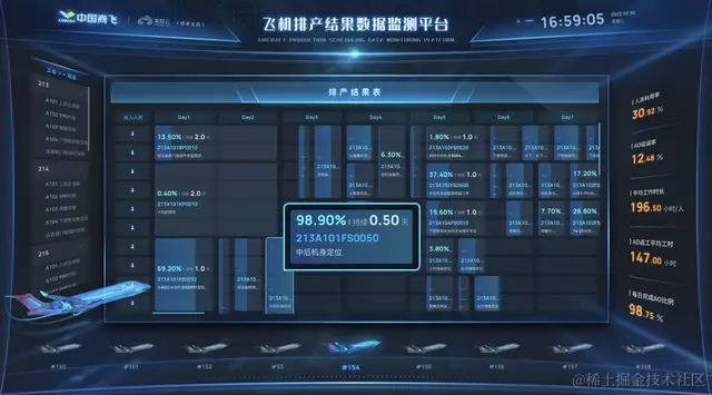 易知微针对上海某飞机公司,围绕排产结果数据监测平台的建设需求,以排产结果为数据导向,展示人员利用率、平均工作时长、AO延误率、AO反功平均工时、每日完成AO比例等数据。通过数据的运算加工,实现每架飞机的工位、站位数据的可视化展示,实现各部门各平台数据信息的融合和信息共享,直观展示各种生产要素。(了解案例详情或更多行业应用可前往易知微官网查看)
