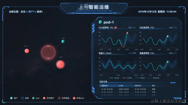 总共可视化大屏分为两部分,分别为总览大屏和明细大屏。总览大屏直接或间接通过饼图等形式展示当前租户、服务、pod的总体情况,呈现三者间的关系,实时的跟新租户、服务和pod的情况,以及系统的性能状况。明细大屏可以查看预警或异常pod信息,以便能够及时的作出反应。(了解案例详情或更多行业应用可前往易知微官网查看)