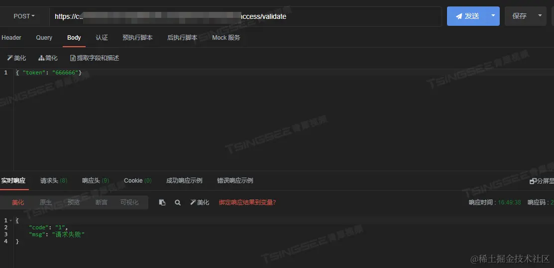 3)请求事例,无效token返回信息code则为1: