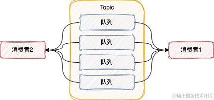 所以从更细化的来说,消息虽然是在Topic底下,但是真正是分布在不同的队列上的,每个队列会有这个Topic下的部分消息。