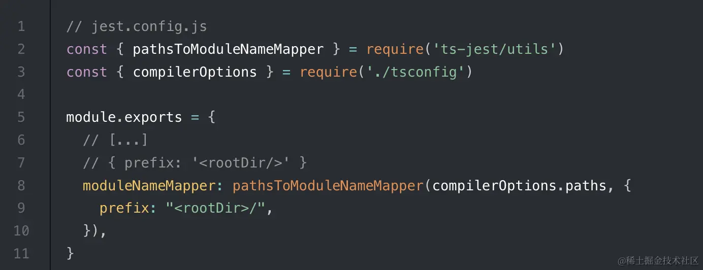 不过可以借助 ts-jest 里的工具函数 pathsToModuleNameMapper 来把 tsconfig.json 里的 paths 配置复制到 jest.config.js 里的 moduleNameMapper