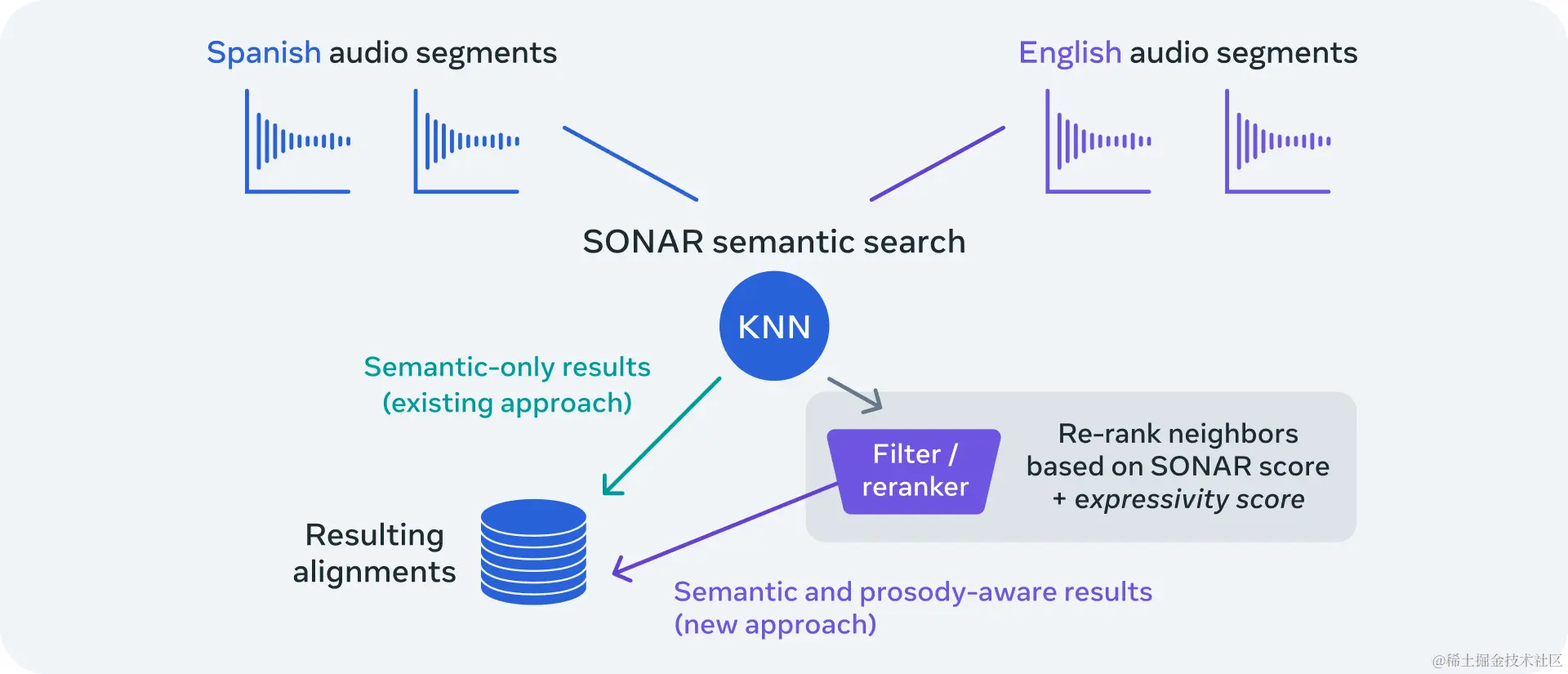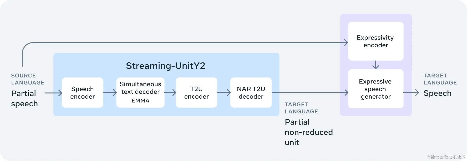 - SeamlessStreaming:一个高效的流媒体翻译模型,能在约2秒延迟内进行语音和文本翻译。