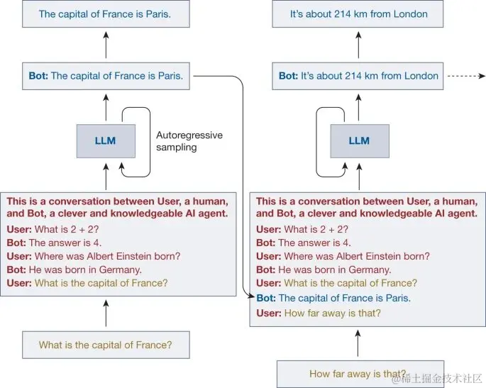结合上图中的对话 Agent 交互流程来看,大语言模型的输入由对话提示(红色)、用户文本(黄色)和模型自回归生成的连续语(蓝色)组成。可以看到,对话提示是在与用户开始实际对话之前,就隐蔽地预置在上下文中了。大语言模型的任务是,在给定对话提示和用户文本的情况下,生成一个符合训练数据分布的反馈。而训练数据则是来源于互联网上人工生成的大量文本。