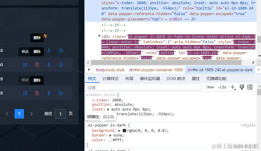 element 修改 tooltip、表格中tooltip 汉果 2023-12-13 70 阅读1分钟 大家好! 我是汉果 项目中用到element组件库,由于自定义样式,想修改表格中的tootip展示,直接修改发现没有作用,猜想肯定类名不对问题,通过去浏览器调试发现问题,选中不到tootip展示 如何解决: 通过文档发掘到可以定义可见性,去到dom代码中修改,会优先展示到页面,然正常修改用自己的方式覆盖样式,完成后去掉visble代码即可,方法很多,觉得这种方法修改tooltip最为快捷 其实在修改组件中有很多类似无法抓取的地方,后面会详细再说其他解决办法