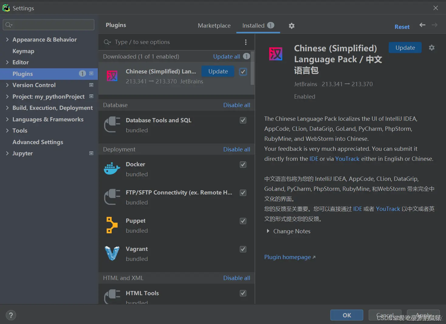 File->Settings->Plugins(插件)在搜索栏中输入Chinese(Simplified)下载中文插件并安装重启PyCharm即出现汉化**