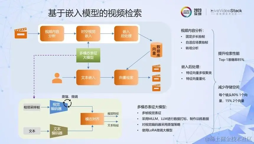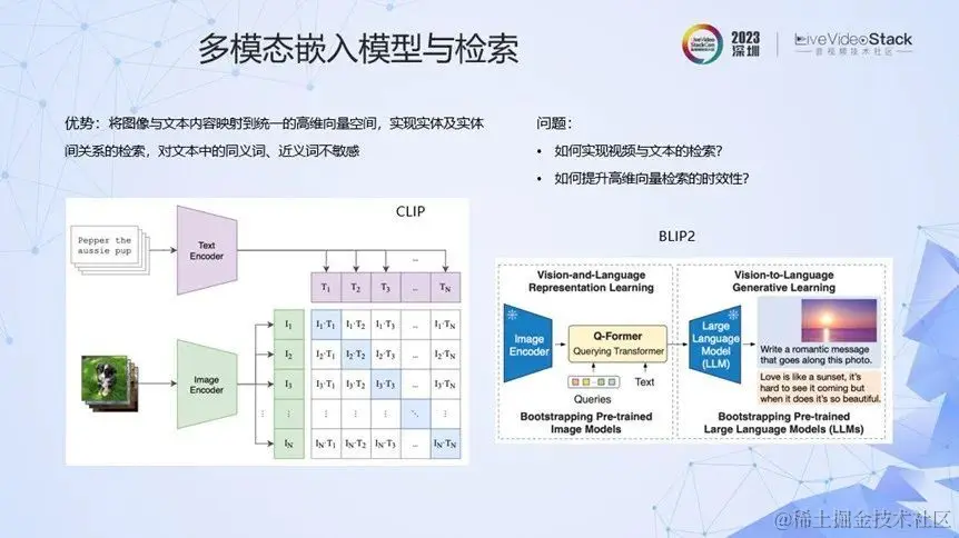我们看到多模态表征技术将图像和文本映射到统一的高维空间中,实现了实体、实体关系等的高质量检索,并对文本中的同义词、近义词不敏感。这些典型的表征技术包括CLIP、BLIP技术等,还有针对中文的ChineseCLIP、TEAM等。但这些技术是针对单帧图像的,而我们的场景都是视频。那如何实现视频的检索?如何提升高维向量检索的时效性呢?