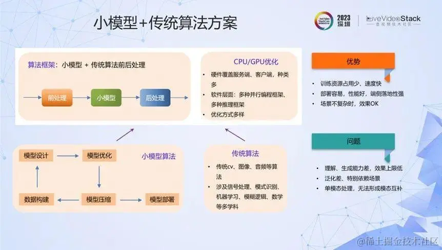 多数情况下,我们采用小模型、传统算法或者两者结合的方法。其优点是:小模型、传统算法在算法开发、工程优化方面已相对比较成熟,小模型的训练资源占用少且训练速度快,部署容易,端侧落地性强。但是问题也比较突出,比如模型的泛化能力差,效果上限比较低,理解、生成能力比较差等。