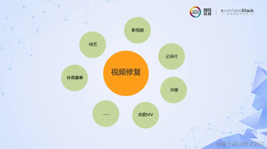 最后看下处理方面的视频修复算法。视频修复的应用场景非常广泛,比如体育赛事、综艺节目、影视剧、纪录片、动漫、老歌MV等场景。