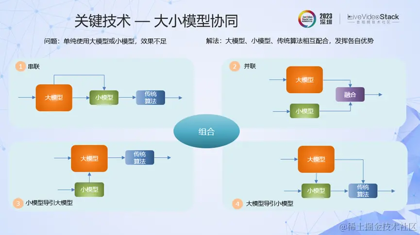 针对前面指出的大模型、小模型或传统算法各自存在的问题,我们提出几种大小模型、传统算法协同的方法,包括三者的串联、并联,用小模型特征引导大模型或者大模型引导小模型,以及它们的组合。目前,我们在实践中已经采用了大小模型协同的方法,比如实景抠图、声音克隆等算法,已经取得了比较好的效果。