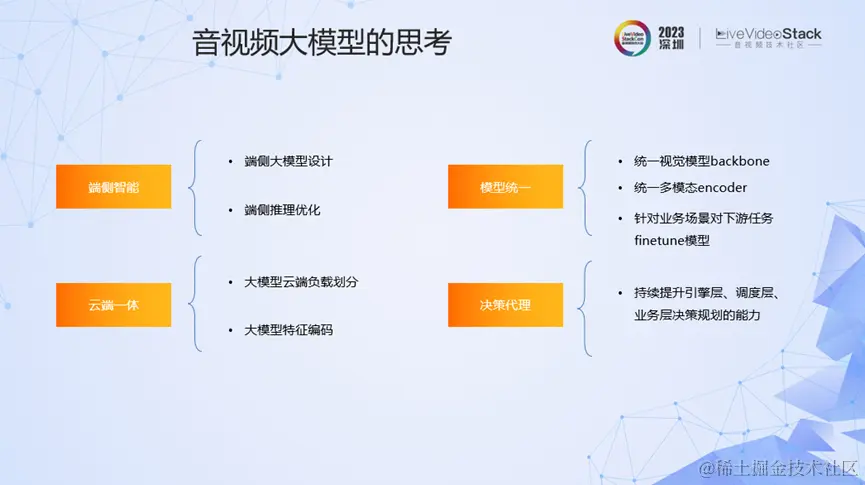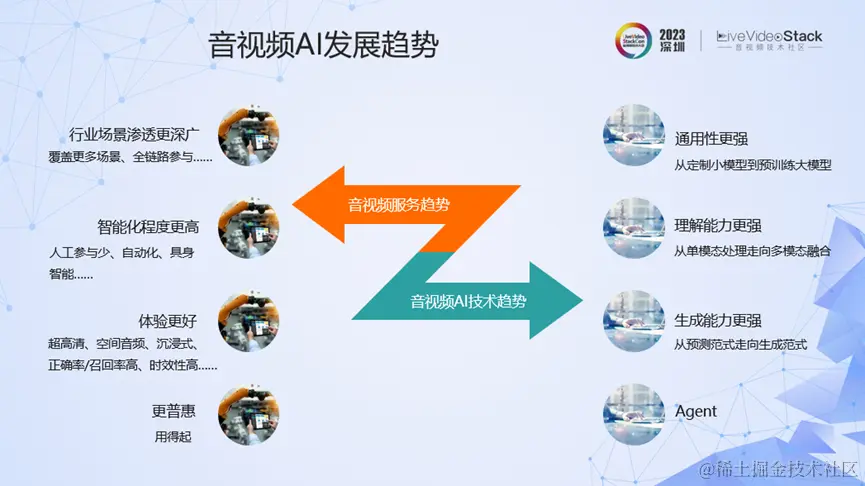 随着AIGC的发展,音视频领域的AI技术也呈现出了新的趋势,即对AI技术的通用性、理解能力、生成能力都提出了更高的要求。过去纯粹的定制小模型开发、单模态处理和预测范式有不少缺陷,触达到了能力上限,而目前音视频AI技术则走向了泛化能力非常强的预训练大模型、多模态信息融合、生成式等方向。还有值得提出的一点是AI Agent的能力,即要求AI有感知、决策、行动的能力,它目前已成为一个重要的研究方向。