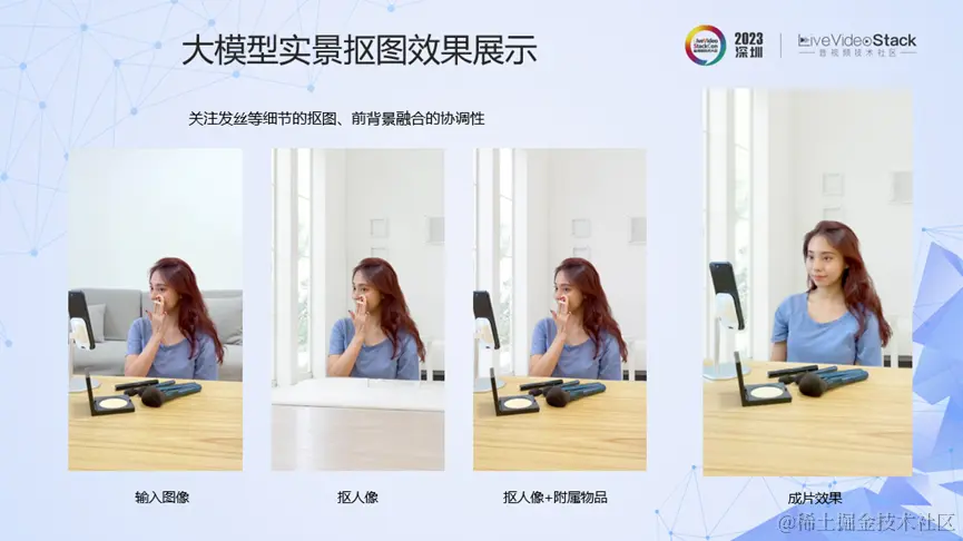 我们看下抠图的效果。对于输入图像,我们实现了抠人像、以及抠人像加桌子/化妆品/手机等附属物的效果。这个抠图质量还是比较高的,特别是发丝抠图效果非常细腻,人物、物体的抠图边缘都很精细。