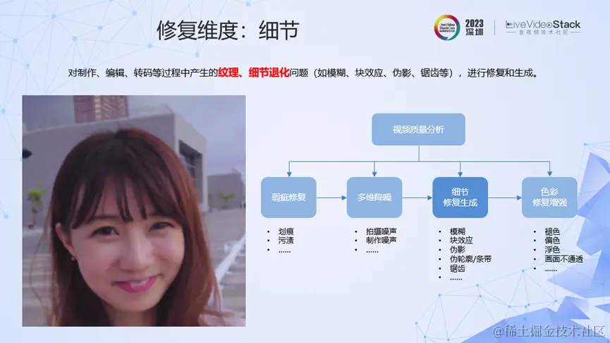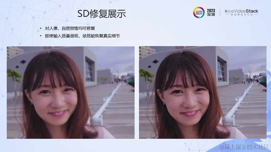 视频修复的维度非常多样,比如针对瑕疵、拍摄或制作中的噪声、细节、色彩等,都可以进行修复。这里讲的视频修复针对的是直播、点播等场景中,在制作、编辑、转码中引入的细节退化问题。如左图所示,我们能看到明显的细节退化,比如模糊、块效应、边缘锯齿等。