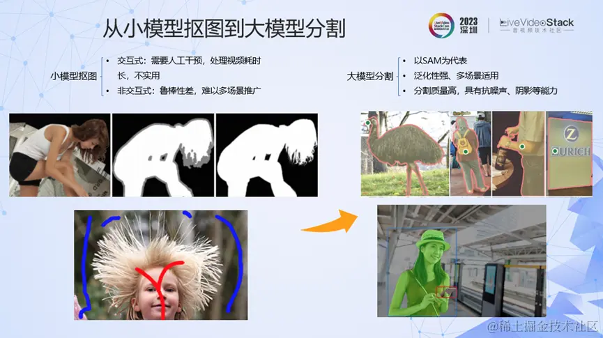 我们先看下小模型方法能否实现高质量抠图。经过深入调研,我们发现很多抠图效果好的方法都采用人工干预的方法,这种方式对单帧图像比较友好,但对于视频,往往处理耗时久,不太实用。而采用非交互式方式的抠图,鲁棒性则较差,往往只能较好地抠人像,难以在多场景推广。