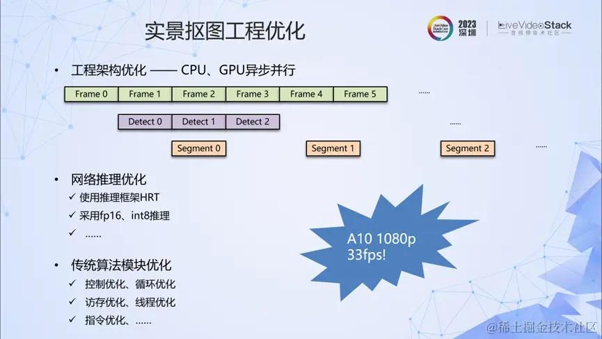 经过算法、工程两方面的优化,对于输入的1080p视频,我们在A10上实现了33fps的高质量抠图。