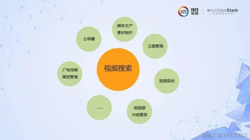 我们再看下媒资管理中的视频搜索。它的应用也非常广,包括广电传媒、云导播、云盘管理、短视频内容推荐、视频监控等。