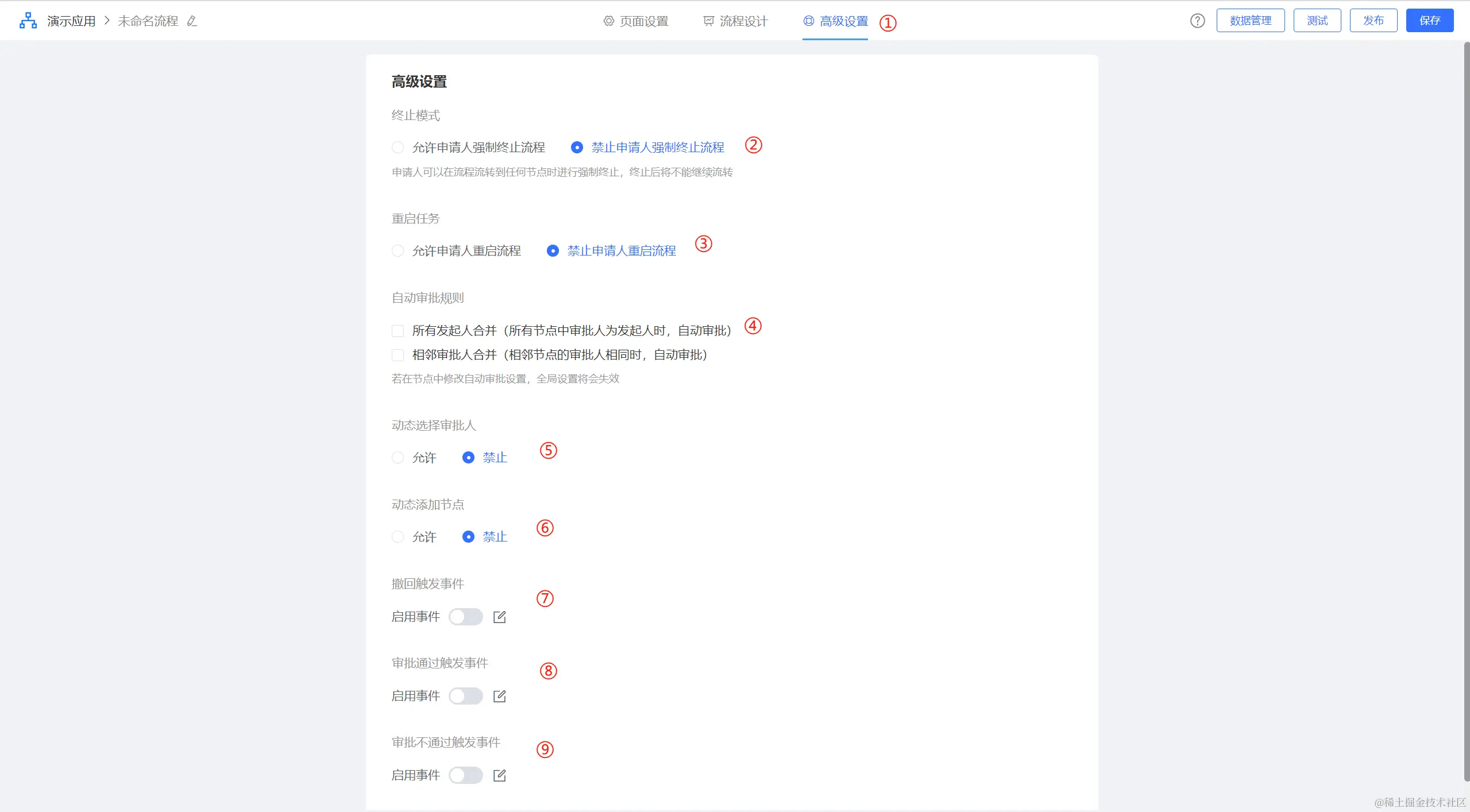 ②:终止模式配置,用于在流程申请发起后,发起人是否可以主动终止流程;