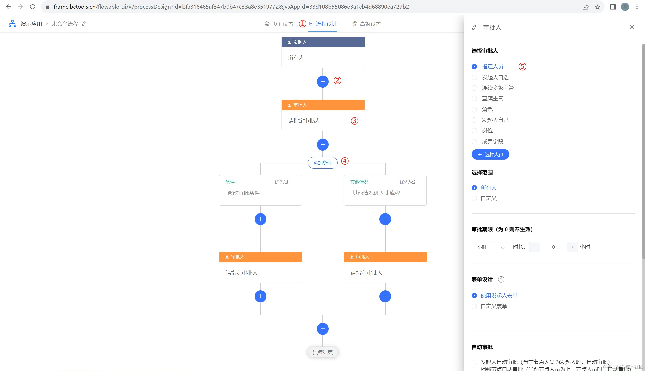 ⑤:动态选择审批人设置:可以在发起流程时界面上选择/修改审批处理的人员;