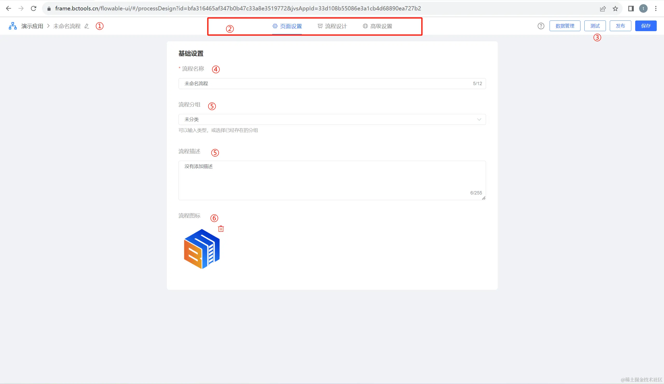 ③:流程的配置按钮,包括数据管理(关联的主要的数据模型),模拟测试、可用性发布和保存的操作按钮;