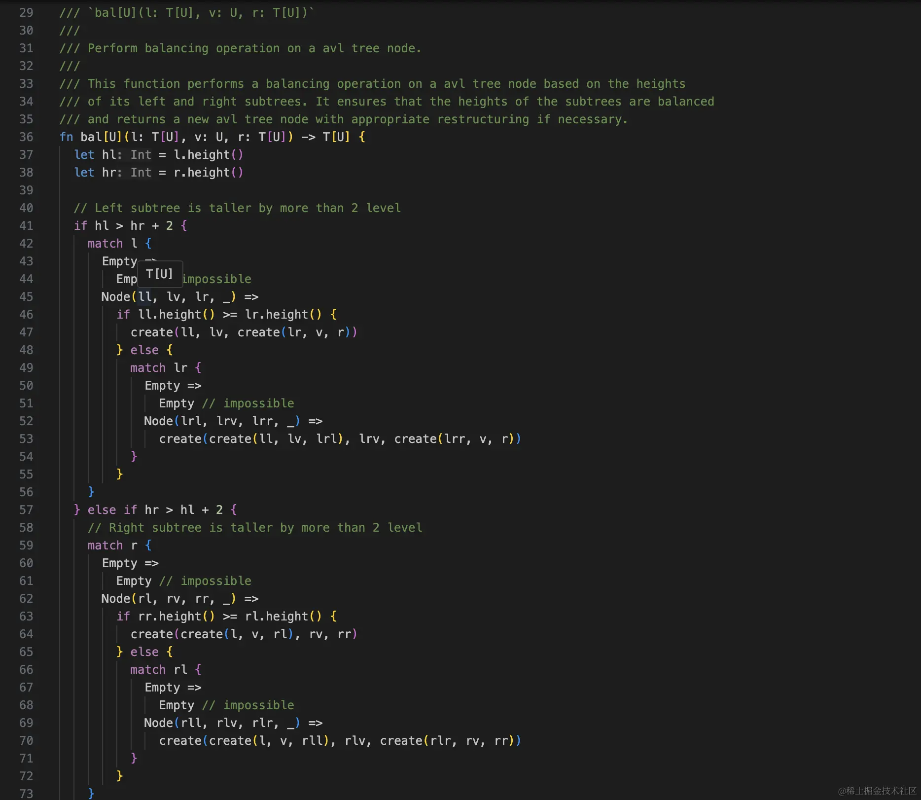 上述函数式数据结构和命令式数据结构的双重优势,让你更深入地理解算法和数据结构的底层原理,尤其是一些复杂的数据结构,MoonBit也可以使用简洁简单的代码表达,提供更高的灵活性与更高的效率。比如以下的例子:AVL树
