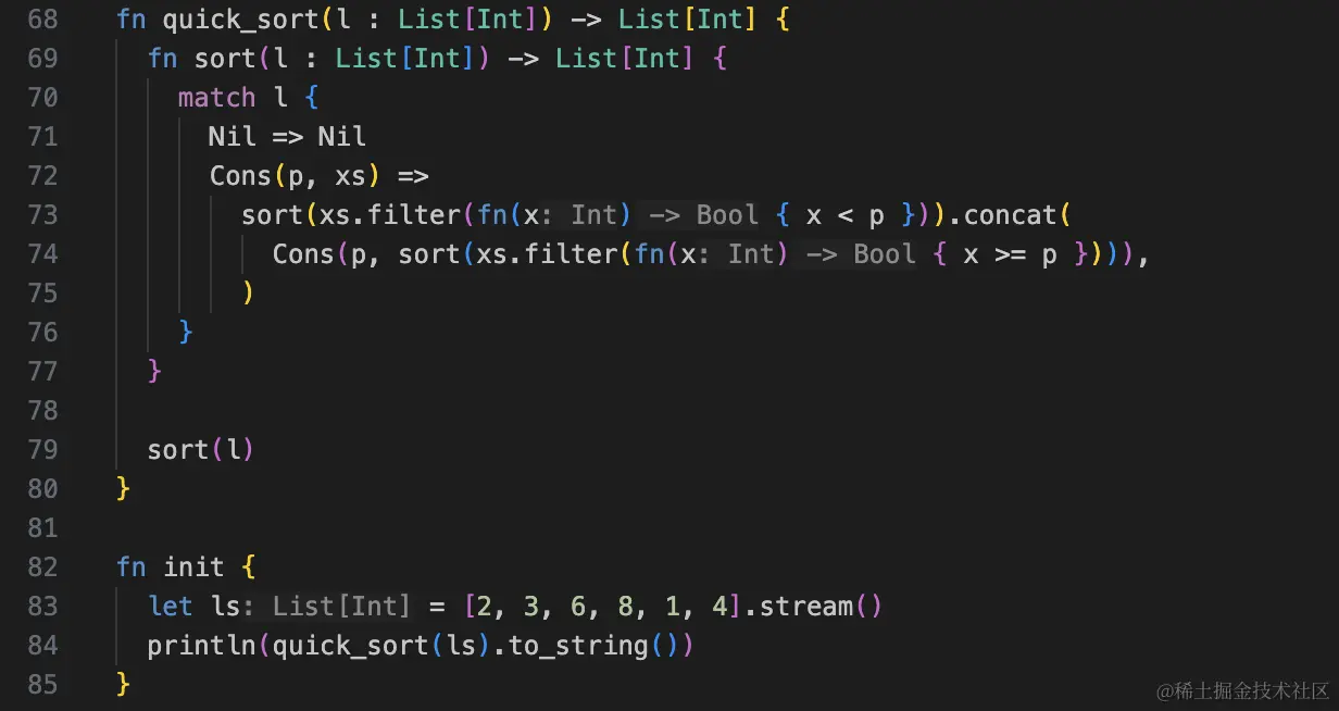 同时,MoonBit还具备函数式编程的特性,如不可变数据结构、模式匹配、高阶函数和尾递归等。这使得它适合用于学习函数式编程中的数据结构和算法,如函数式列表、映射(map)、归约(reduce)操作等。 这里以数组排序为例,MoonBit允许你在一个统一的语境里快速探索函数式和命令式这两种方法。它支持可变数据类型和循环控制结构,使得实现命令式的快速排序成为可能。同时,其对不可变数据结构和递归的优秀支持,也让编写函数式快速排序更为便捷。