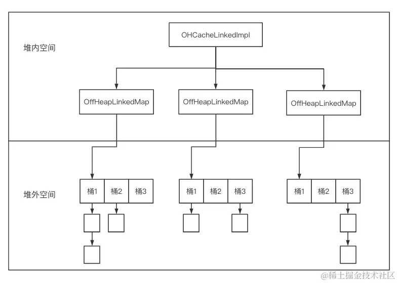 可以看到OHCacheLinkedImpl中包含多个段,每个段用OffHeapLinkedMap来表示。同时,OHCacheLinkedImpl将Java对象序列化成字节数组存储在堆外,在该过程中需要使用用户自定义的CacheSerializer。