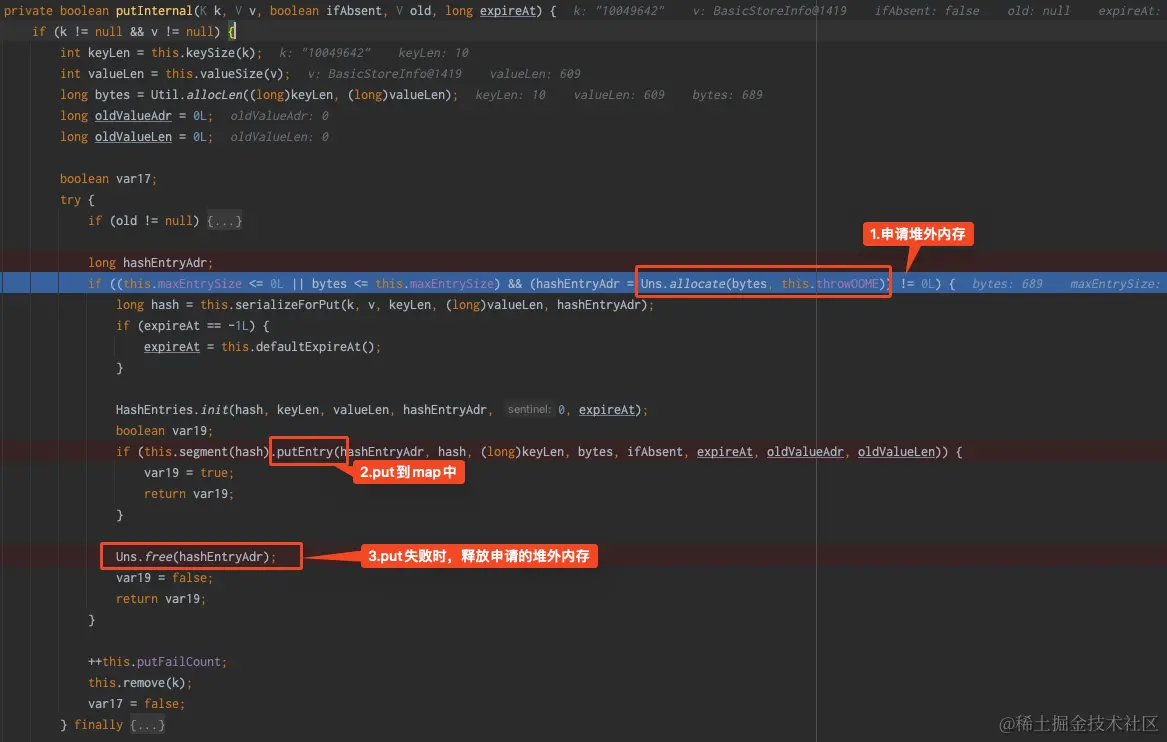 指针在堆内,指针指向的缓存数据存储在堆外。那么OHC最核心的其实就是对堆外内存的地址引用的put和get以及发生在其中内存空间的操作了。