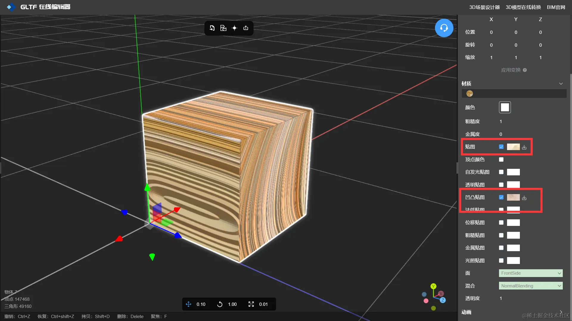 GLTF 编辑器 -NSDT支持常见的贴图类型包括法线贴图、自发光贴图、粗糙度贴图、凹凸贴图、位移贴图、金属贴图、光照贴图等。用户通过材质贴图,可以使模型呈现出不同的材质,如金属、木材、布料等,并且能够模拟反射、阴影和光照效果,使模型在渲染过程中更加真实。