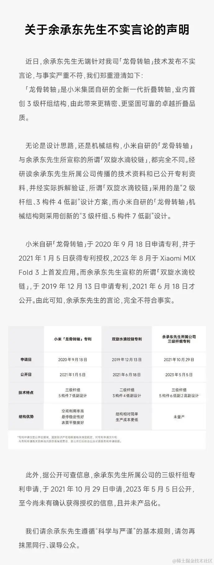 尽管这段表达并没有指名道姓,但在宣传上使用“龙骨”名词的只有小米一家厂商。很快,小米官方账号便在微博上激情开麦,回应了有关“龙骨转轴”技术的质疑。