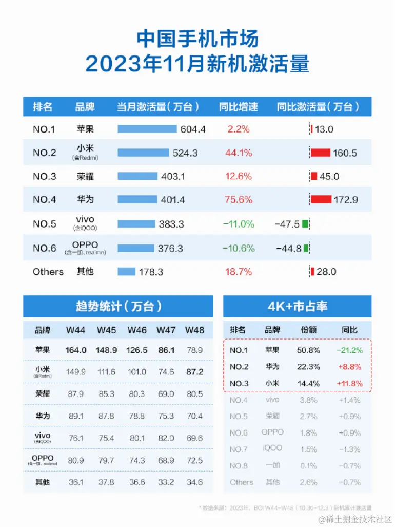 过去的一年是小米的站稳高端的一年。小米14接棒了小米13的强势,根据BCI最新数据,11月中国手机市场,小米以18.3%升至国产品牌第一,苹果以21.1%的份额排名第一。同时在4K+市场份额中,小米份额大涨,仅次于华为和苹果。
