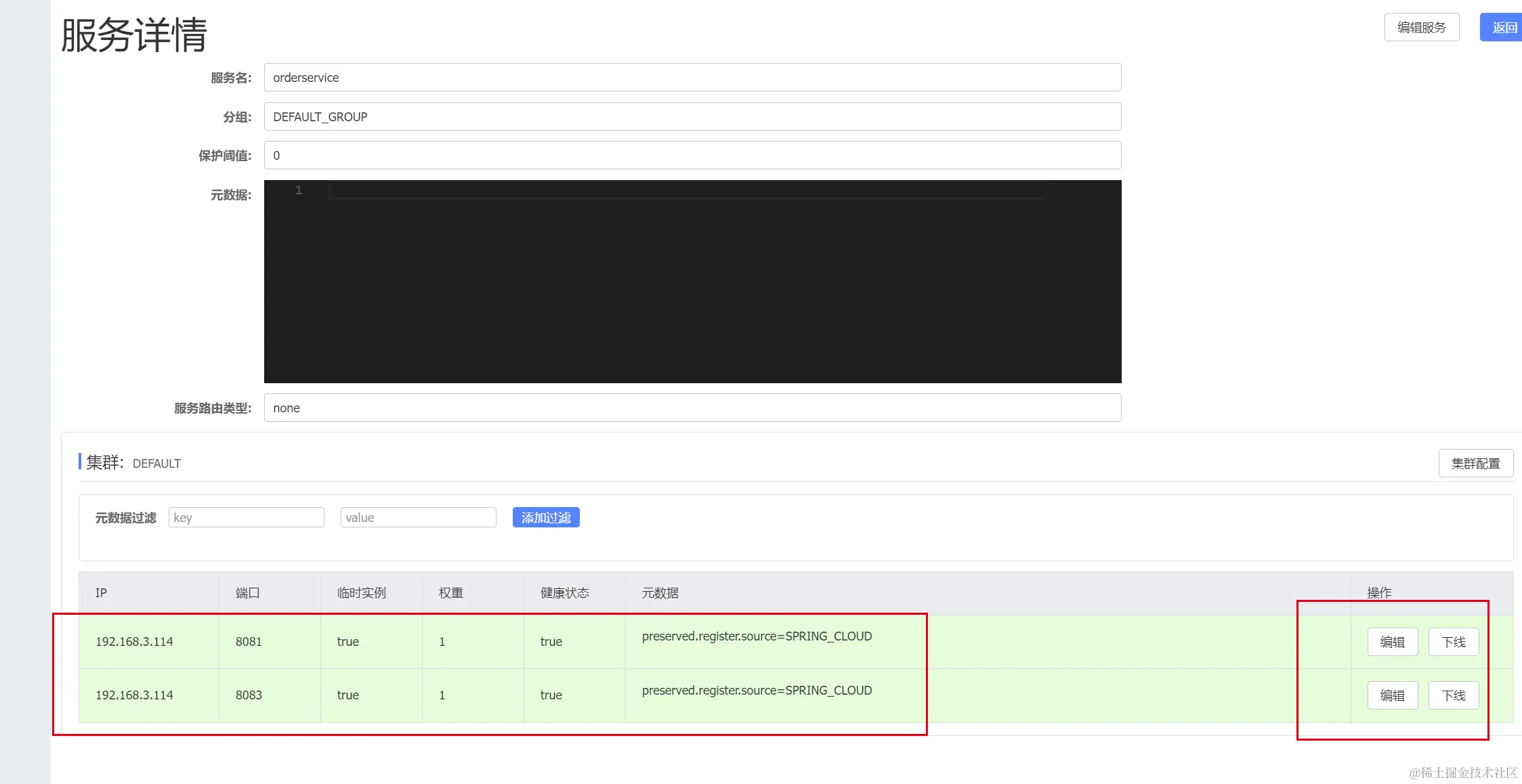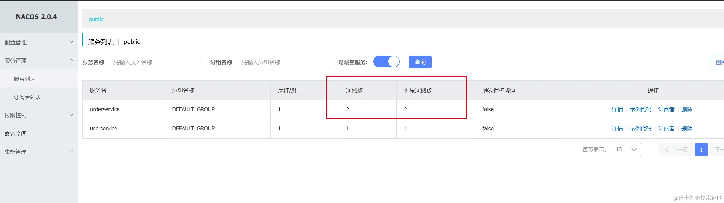 在Nacos的服务列表中出现了两个服务。只不过实例都是1个。代表我们注册成功了。